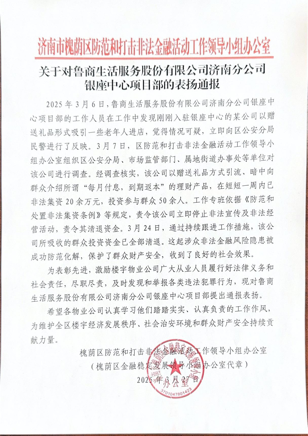近日,魯商服務(wù)濟(jì)南銀座中心受到濟(jì)南市槐蔭區(qū)金融穩(wěn)定發(fā)展領(lǐng)導(dǎo)辦公室的通報表揚(yáng),高度贊譽(yù)項目團(tuán)隊在防范非法集資活動中的表現(xiàn)。