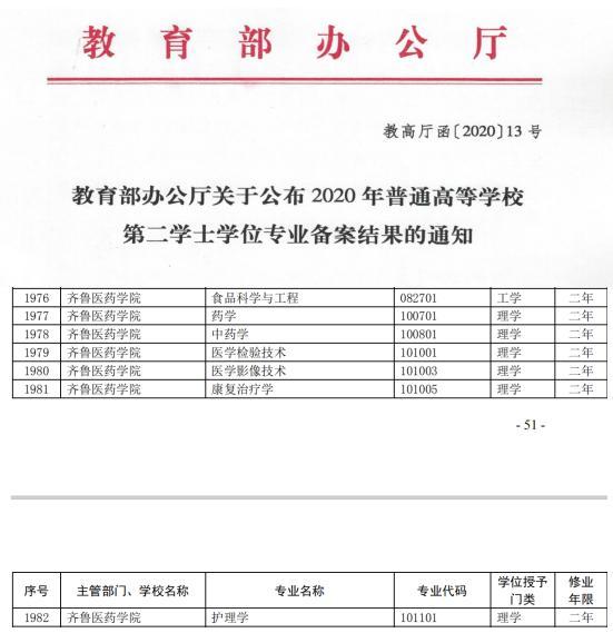 近日,從教育部辦公廳《關于公布2020年普通高等學校第二學士學位專業備案結果的通知》(教高廳函〔2020〕13號)文件獲悉,齊魯醫藥學院申報的藥學、中藥學、食品科學與工程、醫學檢驗技術、醫學影像技術、康復治療學、護理學等7個第二學士學位專業順利通過評審,增列為學院第二學士學位備案專業。
