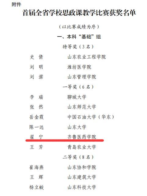 近日,山東省教育廳發(fā)布《關(guān)于公布首屆全省思政課教學(xué)比賽結(jié)果的通知》,齊魯醫(yī)藥學(xué)院青年教師翟寧獲得該比賽本科“基礎(chǔ)”組一等獎(jiǎng)。