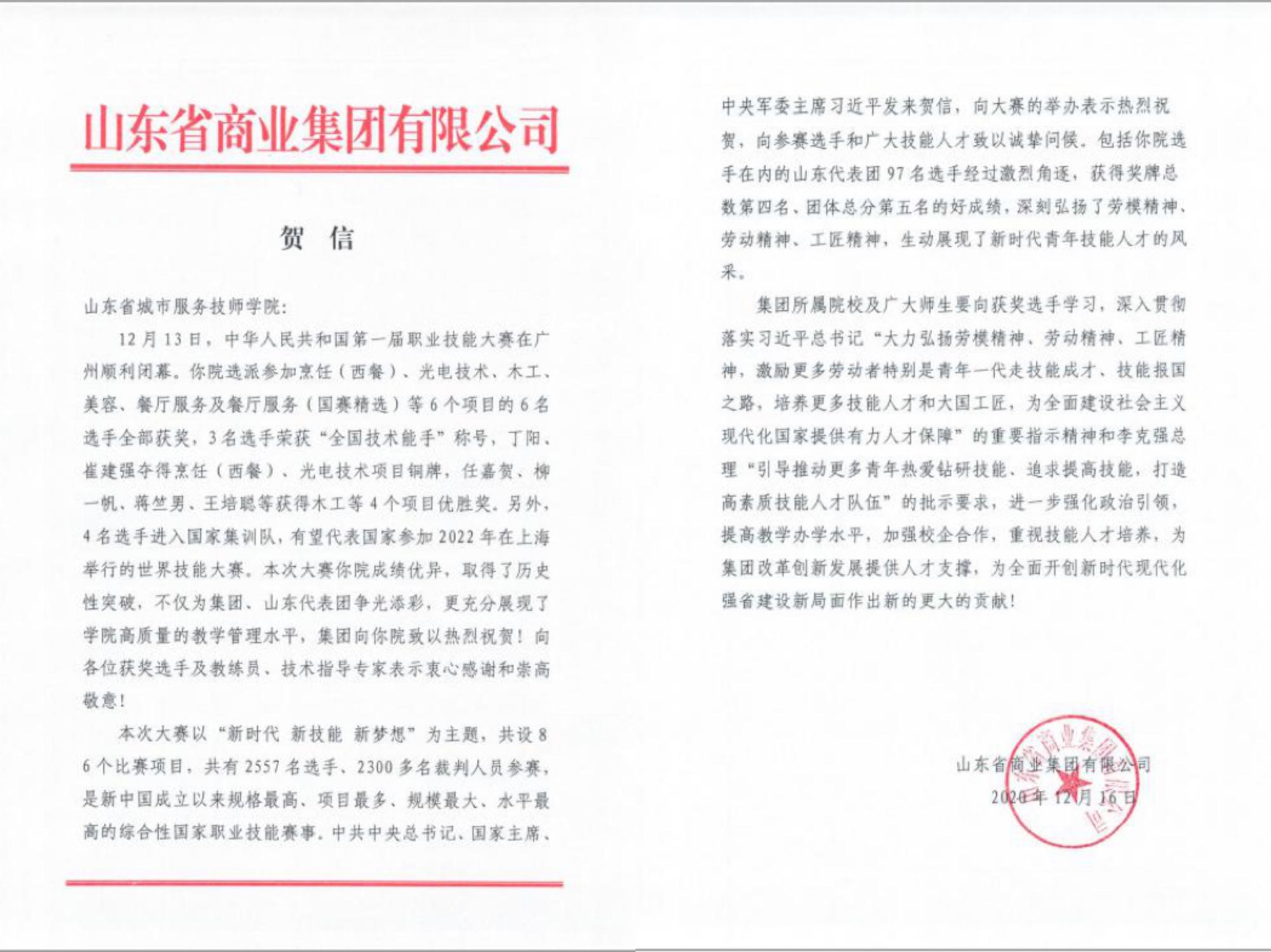 12月13日,首屆全國(guó)職業(yè)技能大賽在廣州順利閉幕。省城市學(xué)院選派參加烹飪(西餐)、光電技術(shù)、木工、美容、餐廳服務(wù)及餐廳服務(wù)(國(guó)賽精選)項(xiàng)目的6位選手全部獲獎(jiǎng),其中3位選手榮獲全國(guó)技術(shù)能手稱號(hào),有4位選手進(jìn)入國(guó)家集訓(xùn)隊(duì),有望參加2022年在上海舉行的世界技能大賽。魯商集團(tuán)賽后致賀信,對(duì)學(xué)院取得的優(yōu)異成績(jī)表示祝賀!