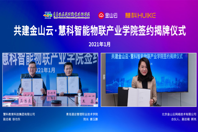 1月13日,青島酒店學(xué)院與北京金山云網(wǎng)絡(luò)技術(shù)有限公司、慧科教育科技集團(tuán)“金山云·慧科智能物聯(lián)產(chǎn)業(yè)學(xué)院”舉行簽約揭牌儀式。北京金山云網(wǎng)絡(luò)技術(shù)有限公司合伙人郭嵐,慧科教育科技集團(tuán)有限公司副總裁徐功東,學(xué)院黨委書(shū)記李達(dá)、院長(zhǎng)姜玉鵬出席簽約揭牌儀式,黨委副書(shū)記王鑫主持。