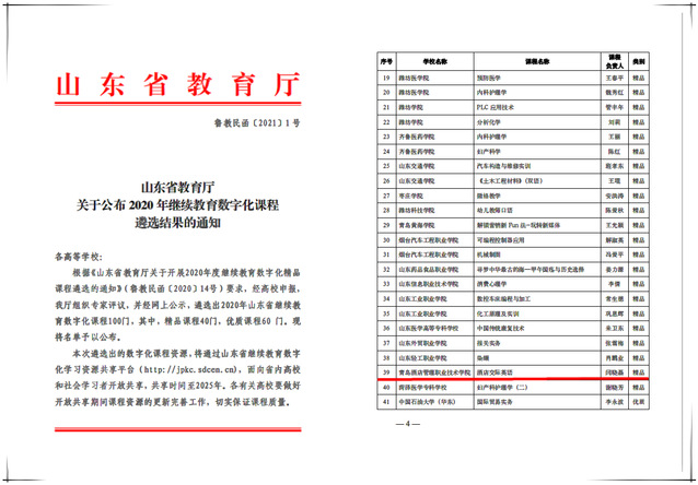 1月10日,省教育廳下發(fā)《關(guān)于公布2020年繼續(xù)教育數(shù)字化課程遴選結(jié)果的通知》(魯教民函﹝2021﹞1號(hào)),青島酒店學(xué)院3門(mén)課程入選山東省2020年度繼續(xù)教育數(shù)字化課程。