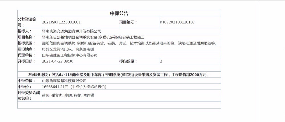 近日,在濟南軌道交通集團關于濟南東總部基地項目空調設備(多聯(lián)機)采購及安裝工程施工項目競標中,魯商智慧科技公司順利中標該項目,中標金額約1697萬元。