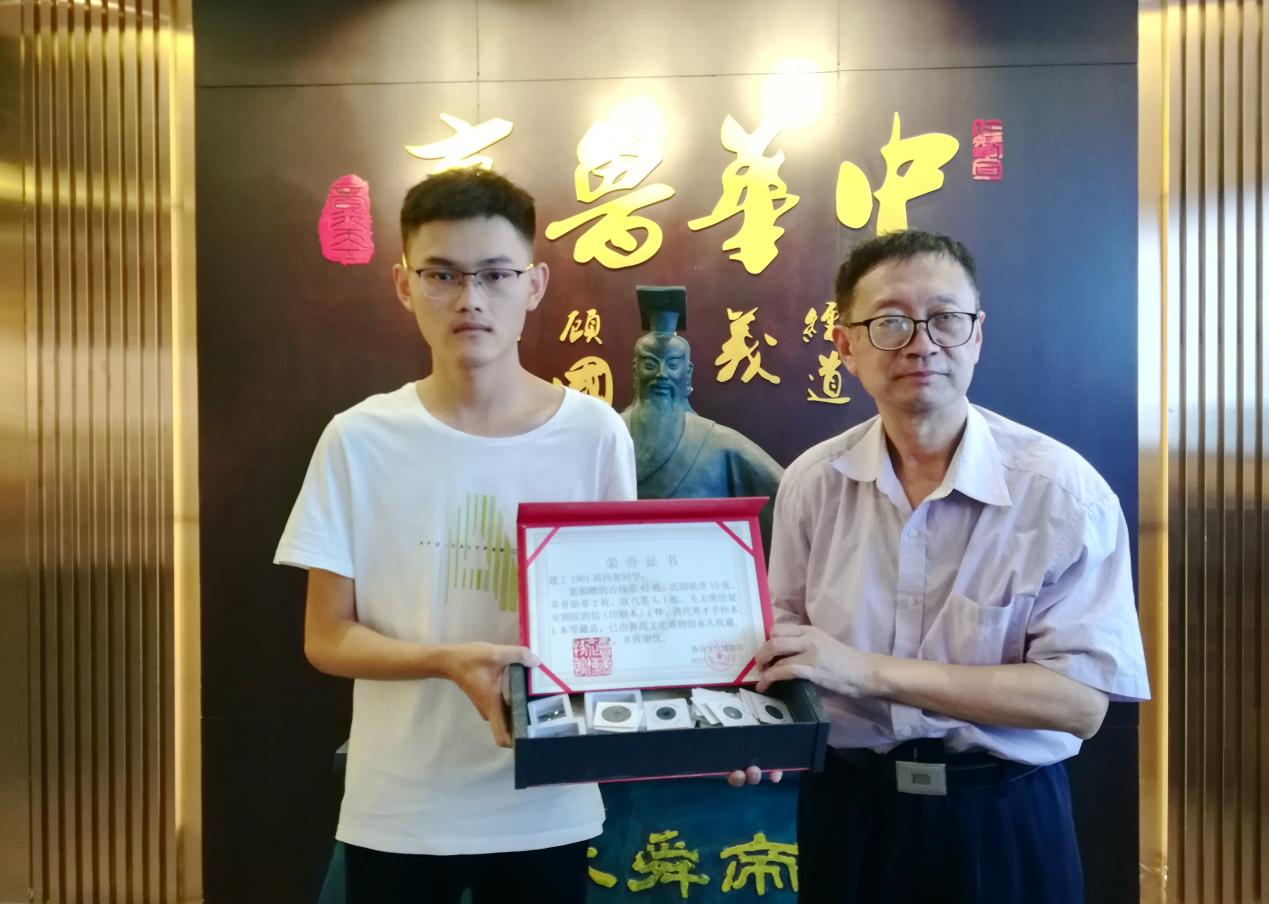 馮賀自幼對中國傳統(tǒng)文化懷有濃厚的興趣,喜歡收藏各種古錢幣、紀念品等,在即將離校實習之際,他懷著對學校的深厚感情捐贈藏品,支持學校“雙高計劃”建設(shè)。