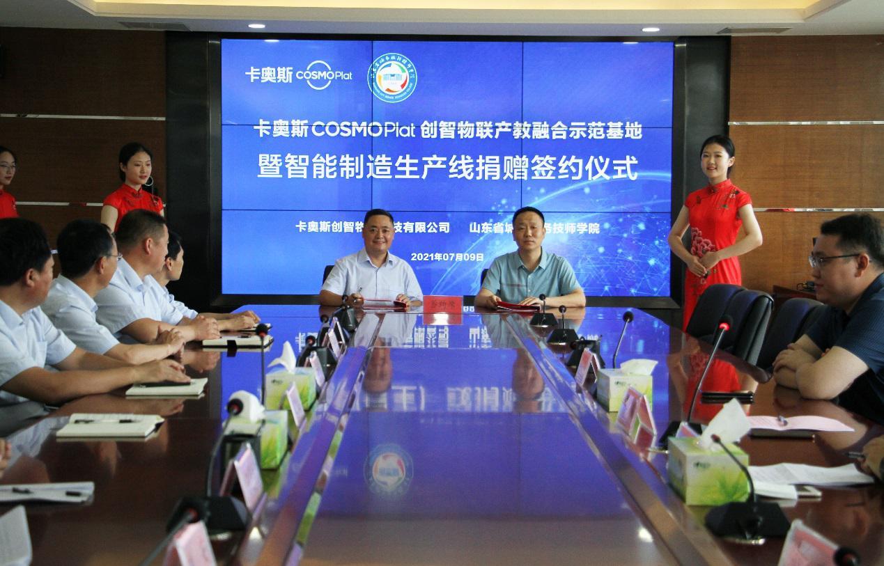 7月9日,省城市學院與海爾卡奧斯COSMOPlat創智物聯產教融合示范基地揭牌暨智能制造生產線捐贈簽約儀式舉行。學院黨委副書記刁洪斌,卡奧斯創智物聯科技有限公司青島工廠總經理高廣偉出席簽約儀式。