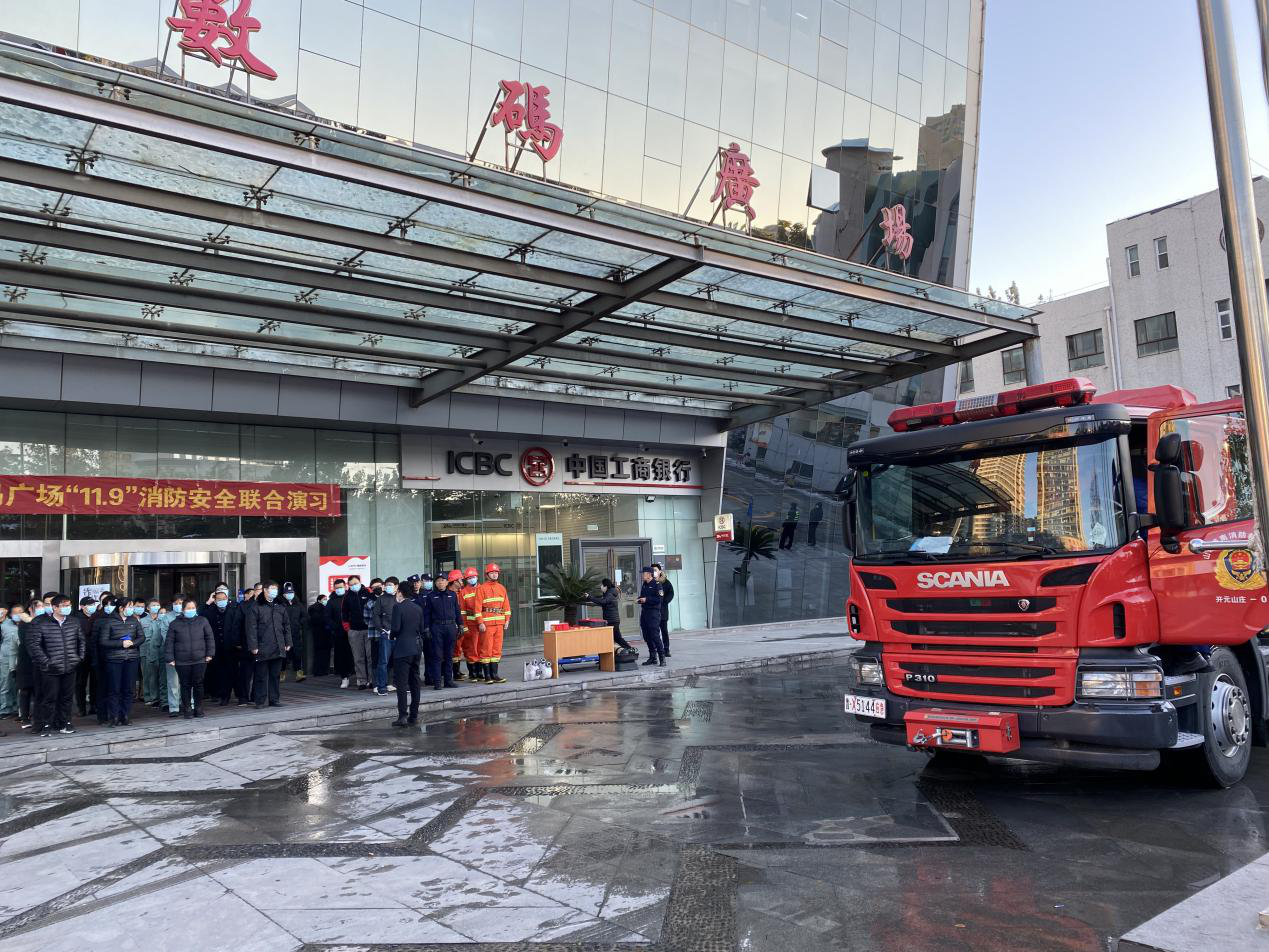 在濟南魯商銀座數碼廣場項目服務中心,演習模擬電線短路引發火情導致煙感報警,中控室接到火警后立即通知巡邏人員趕往現場查看并展開撲救。由于火勢升級,服務中心啟動火災應急處置預案,全樓播放消防疏散廣播,疏散組成員立即到位,引導樓內人員迅速有序疏散到樓外安全區域,滅火行動組穿好戰斗服及自救呼吸器,攜帶滅火工具到達著火樓層,在轉移傷員同時進行滅火處置。整個演習過程緊張有序,達到了預期效果,體現了魯商服務對消防安全工作的一貫重視。