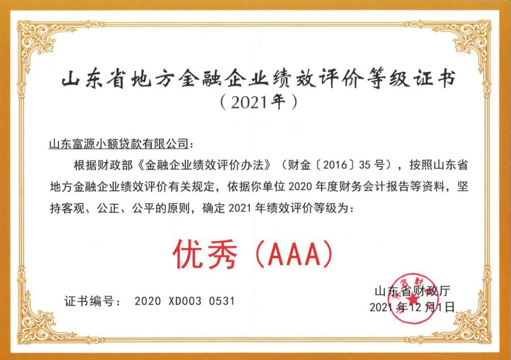 近日,省財政廳頒發(fā)2021年山東省金融企業(yè)績效評價等級證書,富源小貸獲得“AAA”優(yōu)秀等級。評價結果表示,其績效狀況在全國其他類金融企業(yè)中處于優(yōu)秀水平。至此公司已連續(xù)3年獲此最高評價。