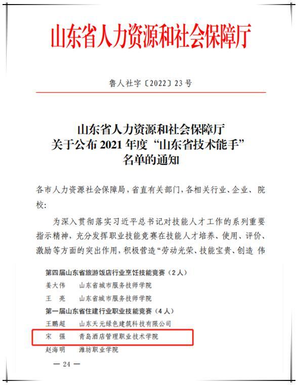 近日,省人社廳公布2021年度“山東省技術(shù)能手”名單,青島酒店學(xué)院教師獲評“山東省技術(shù)能手”稱號。