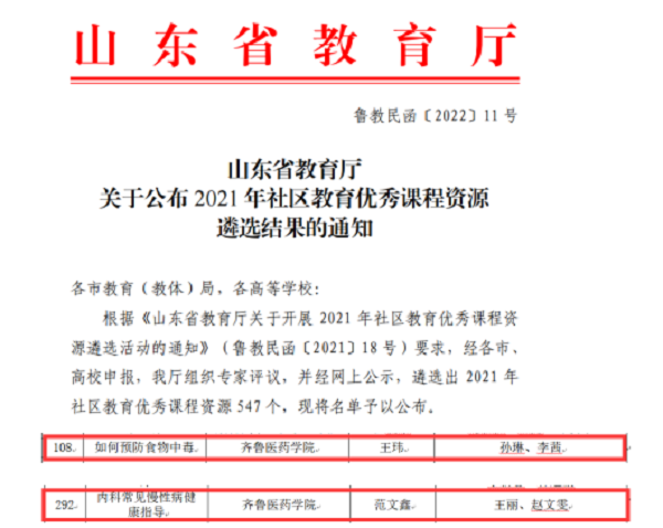 近日,省教育廳公布2021年社區(qū)教育優(yōu)秀課程資源遴選結果,齊魯醫(yī)藥學院《如何預防食物中毒》《內科常見慢性病健康指導》2門課程被評為優(yōu)秀課程資源。省教育廳擬將其推介到國家終身教育智慧教育平臺。