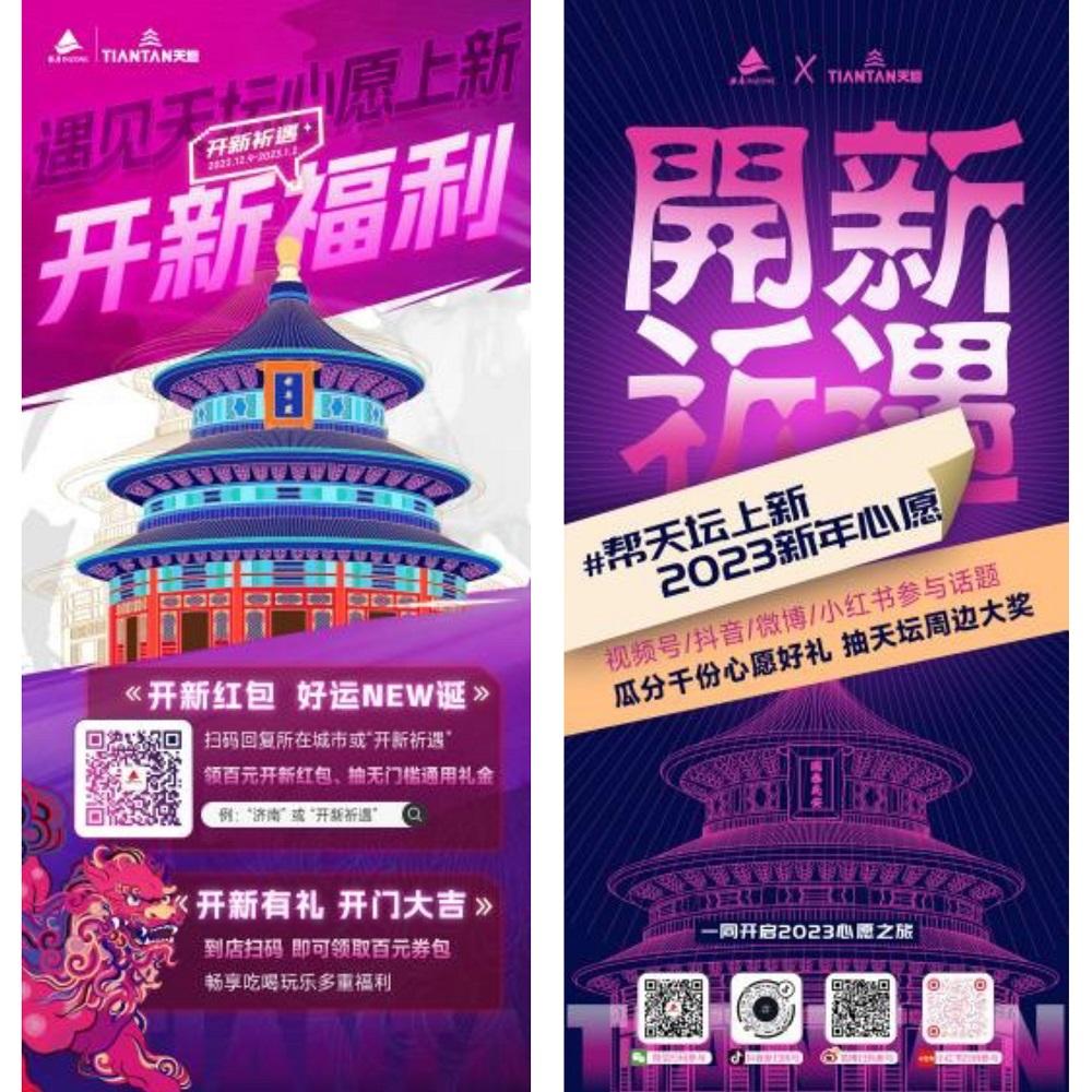 在本次跨年季,銀座集團圍繞年終消費場景核心需求,通過情感營銷主導突圍年終營銷,借勢IP內(nèi)核打造差異化療愈體驗。線下打造具有網(wǎng)紅屬性的創(chuàng)意天壇系列裝置,讓消費者沉浸式游逛;線上參與話題“#幫天壇上新2023新年心愿”可瓜分千份心愿好禮,助力心愿達成。12月31日,25城共同打造萬人冬祈盛典跨年派對,為城市送上溫暖的祝福,一同許下2023美好心愿。