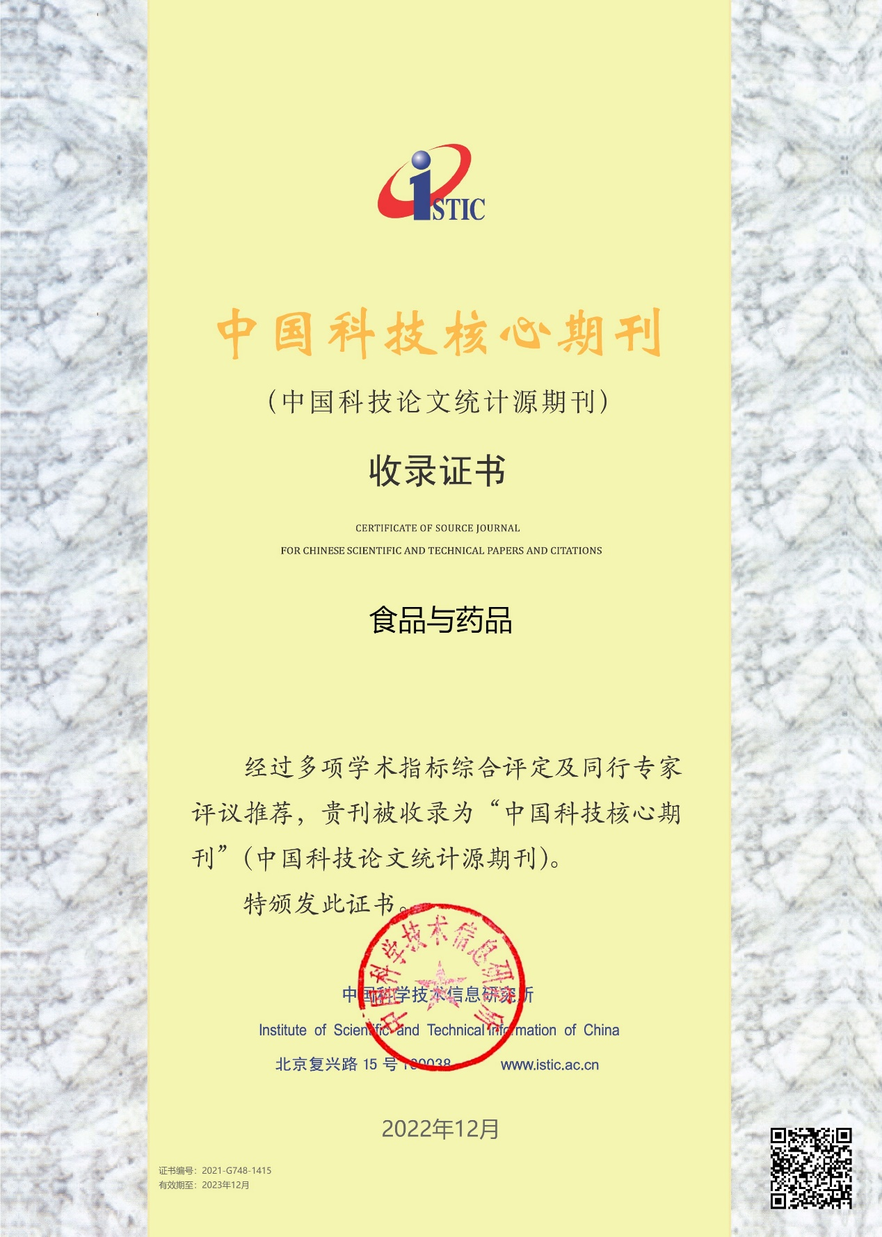 近日,2022年中國科技核心期刊(中國科技論文統(tǒng)計源期刊,CSTPCD)目錄發(fā)布,由山東省商業(yè)集團(tuán)有限公司主管和山東省藥學(xué)科學(xué)院主辦的《食品與藥品》實(shí)現(xiàn)連續(xù)多年入選此目錄。