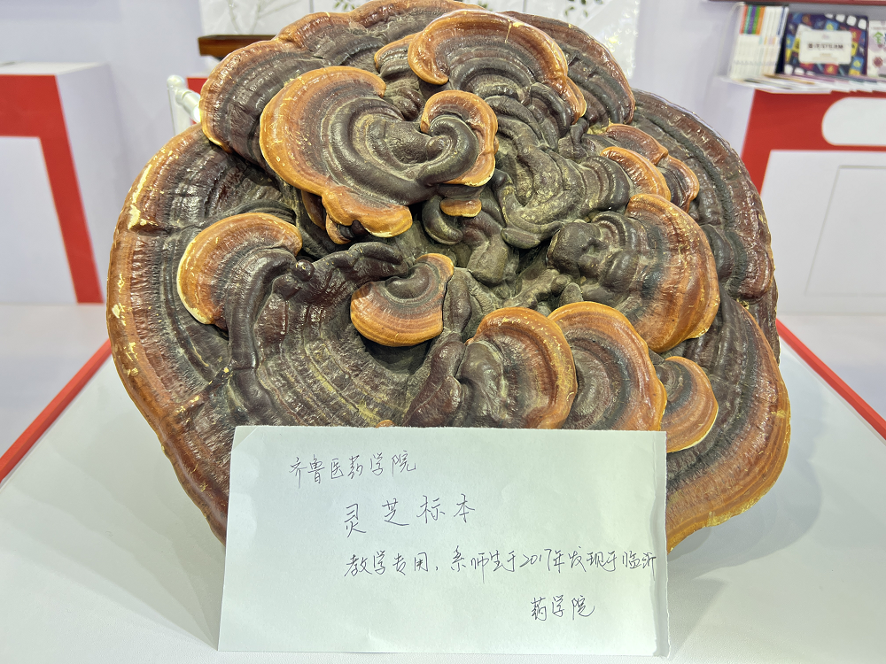 現(xiàn)場(chǎng)的透明玻璃展柜里,一個(gè)直徑45厘米的碩大野生靈芝十分引人矚目,旁邊還有水牛角、鹿茸、龜甲、蛤蚧等名貴中藥材,這些都是齊魯醫(yī)藥學(xué)院在現(xiàn)場(chǎng)展示的中藥材教具。此外,還有防風(fēng)、蜀葵、白薇、忍冬等中藥材標(biāo)本,每個(gè)藥材標(biāo)本都用一張白紙板裝裱,懸掛在墻上宛若一幅幅畫作,成為獨(dú)具特色的一景。