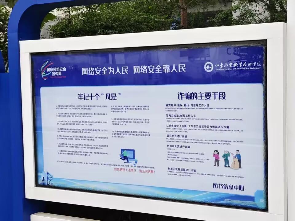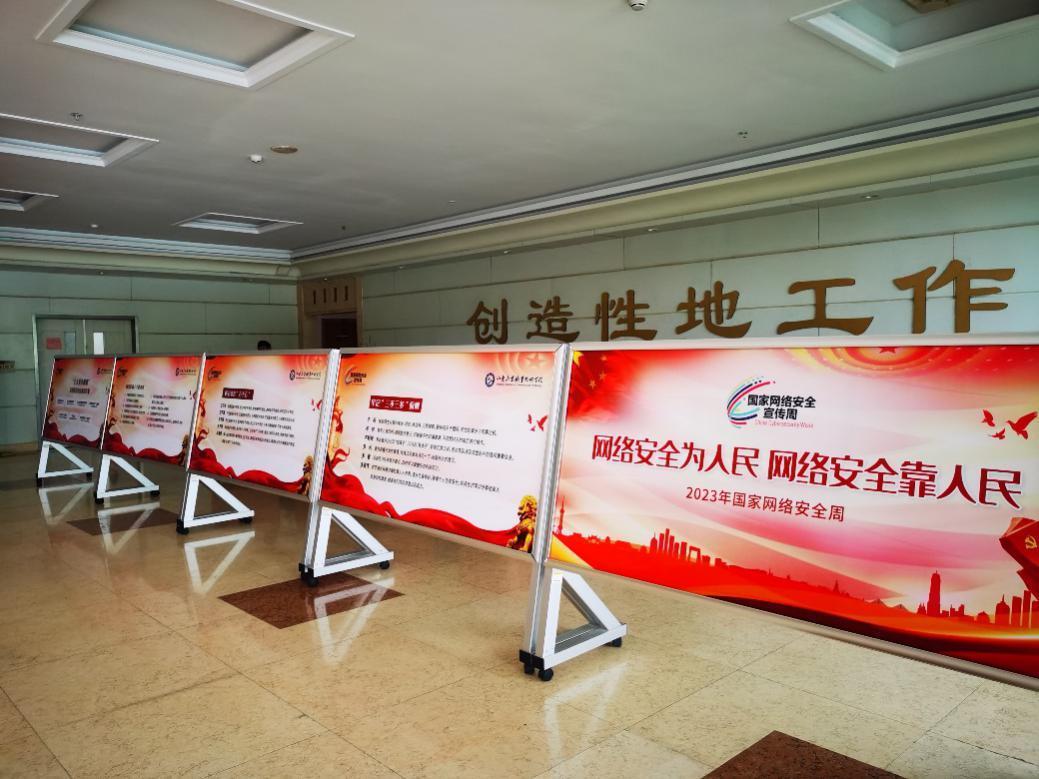 學(xué)院在辦公樓、教學(xué)樓、圖書館大廳、學(xué)生餐廳等處設(shè)置電子屏、展架、海報、條幅等宣傳物料,形成固定的宣傳陣地,普及網(wǎng)絡(luò)安全知識。