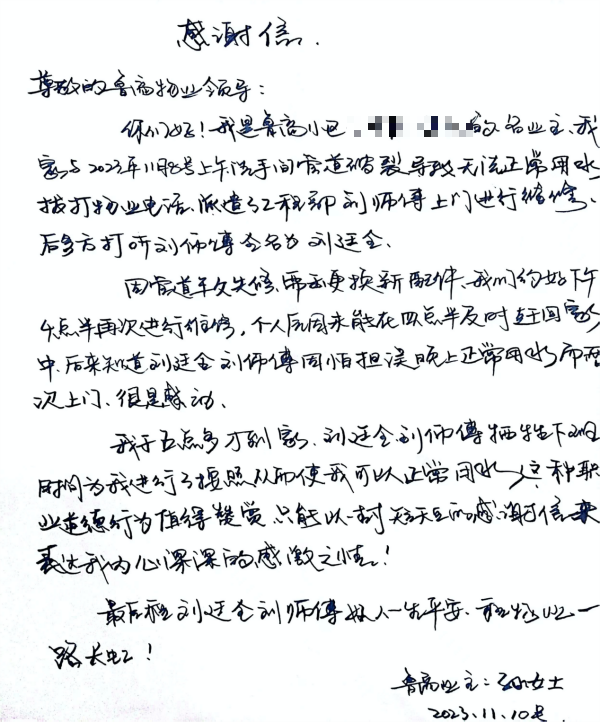 11月10日,魯商服務青島城市公司藍岸國際項目服務中心收到業(yè)主孫女士送來的手寫感謝信,感謝工程部水暖應急小組的敬業(yè)與辛勤付出,為一家人溫暖過冬解除了后顧之憂。