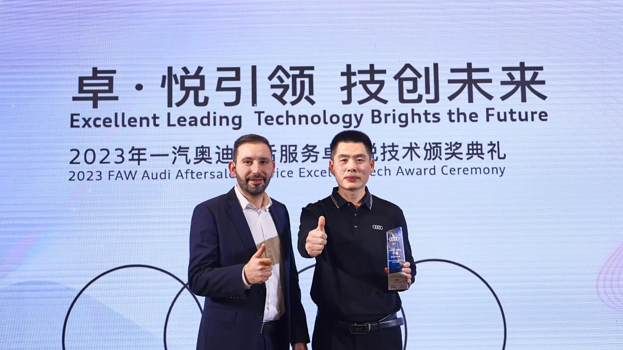 近日,一汽奧迪售后服務卓悅技術頒獎典禮圓滿落幕。山東銀座天尊汽車有限公司(以下簡稱銀座天尊)技術經理趙福山及團隊憑借專業的技術知識和強勁實力斬獲2023年一汽奧迪“十強”優秀技術經理、奧迪專業雙杯競賽技術杯第一名、奧迪維修技術平臺優秀案例一等獎等殊榮,他們以精準高效、專業務實的技術能力,更好支撐售后技術服務業務,銀座天尊被授予山東省唯一一家“一汽奧迪售后服務技術中心站”。