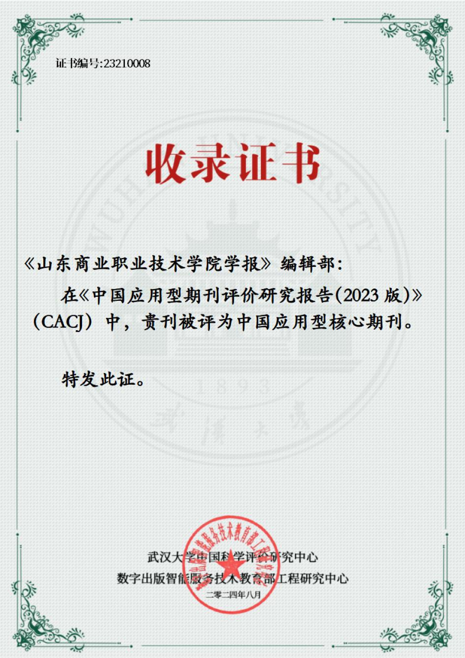 近日,武漢大學(xué)中國科學(xué)評價研究中心、數(shù)字出版智能服務(wù)技術(shù)教育部工程研究中心聯(lián)合開展的國內(nèi)首次應(yīng)用型期刊評價工作順利完成,《中國應(yīng)用型期刊評價研究報告(2023版)》正式發(fā)布,《山東商業(yè)職業(yè)技術(shù)學(xué)院學(xué)報》被評為中國應(yīng)用型核心期刊。