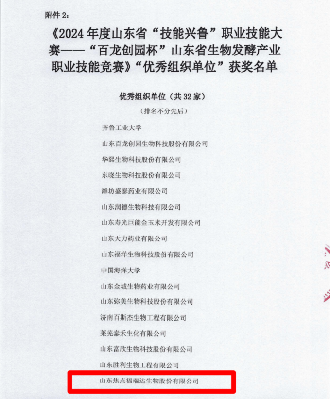 近日,2024年度山東省“技能興魯”職業(yè)技能大賽——山東省生物發(fā)酵產(chǎn)業(yè)職業(yè)技能競賽獲獎(jiǎng)名單公布,福瑞達(dá)旗下焦點(diǎn)福瑞達(dá)、福瑞達(dá)生物科技、福瑞達(dá)生物股份憑借優(yōu)異的競賽成績和良好的作風(fēng)表現(xiàn)被大賽組委會評選為“優(yōu)秀組織單位”。在職工組化學(xué)檢驗(yàn)工、生化檢驗(yàn)工、淀粉及淀粉糖制造工3個(gè)競賽項(xiàng)目中,13名職工榮獲個(gè)人一、二、三等獎(jiǎng)。