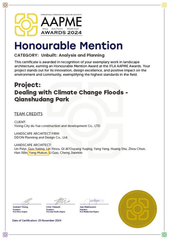 近日,國際風(fēng)景園林師聯(lián)合會(IFLA)正式公布IFLA AAPME Awards 2024國際風(fēng)景園林師聯(lián)合會亞太景觀設(shè)計(jì)獎(jiǎng)獲獎(jiǎng)名單,青島酒店管理職院教師楊牧昆主持的宜興錢墅蕩公園項(xiàng)目榮獲分析與規(guī)劃類銅獎(jiǎng)。