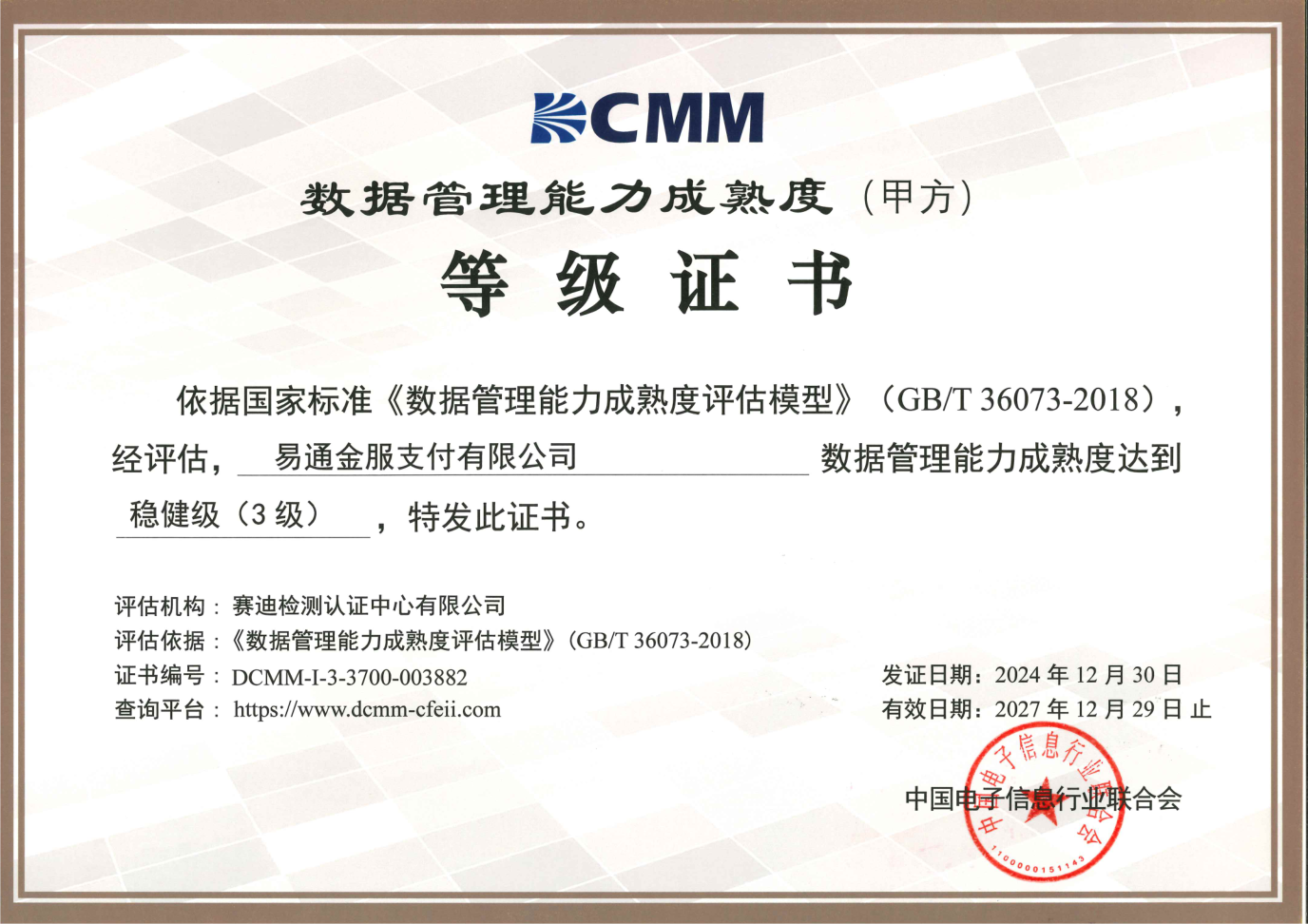 近日,中國電子信息行業(yè)聯(lián)合會(huì)公布最新一批獲得數(shù)據(jù)管理能力成熟度等級證書的單位,魯商科技所屬易通金服順利取得數(shù)據(jù)管理能力成熟度穩(wěn)健級(3級)認(rèn)證,該等級是千人規(guī)模以下企業(yè)可獲得的最高等級認(rèn)證,標(biāo)志著公司數(shù)據(jù)管理能力達(dá)到行業(yè)領(lǐng)先標(biāo)準(zhǔn),數(shù)字化水平建設(shè)再上新臺(tái)階。