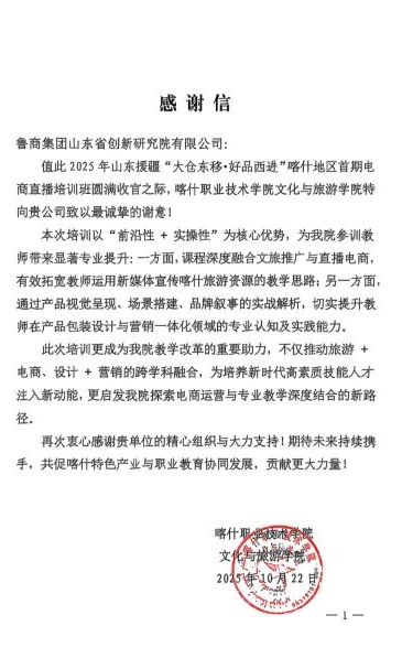 在2025年山東援疆“大倉(cāng)東移 好品西進(jìn)”工程深入推進(jìn)之際,首期電商直播培訓(xùn)班圓滿結(jié)業(yè)。近日,喀什職業(yè)技術(shù)學(xué)院文化與旅游學(xué)院向培訓(xùn)主承辦單位山東省對(duì)口支援新疆工作指揮部、喀什地區(qū)商務(wù)局、魯商科技所屬創(chuàng)新研究院有限公司致信感謝,感謝此次培訓(xùn)提升了學(xué)校電商專業(yè)教師提升專業(yè)素養(yǎng)和教學(xué)能力。